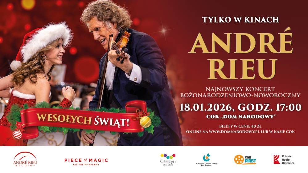 Cieszyński Ośrodek Kultury "Dom Narodowy" oraz Kino Piast zapraszają na olśniewające show Maestra André Rieu. Zapraszamy do Cieszyńskiego Ośrodka Kultury "Dom Narodowy" na retransmisję najnowszego koncertu bożonarodzeniowo-noworocznego z Maastricht pod tytułem „Wesołych Świąt!”. Projekcja koncertu odbędzie się w niedzielę 18 stycznia oraz ponownie, w niedzielę 1 lutego o godzinie 17:00.